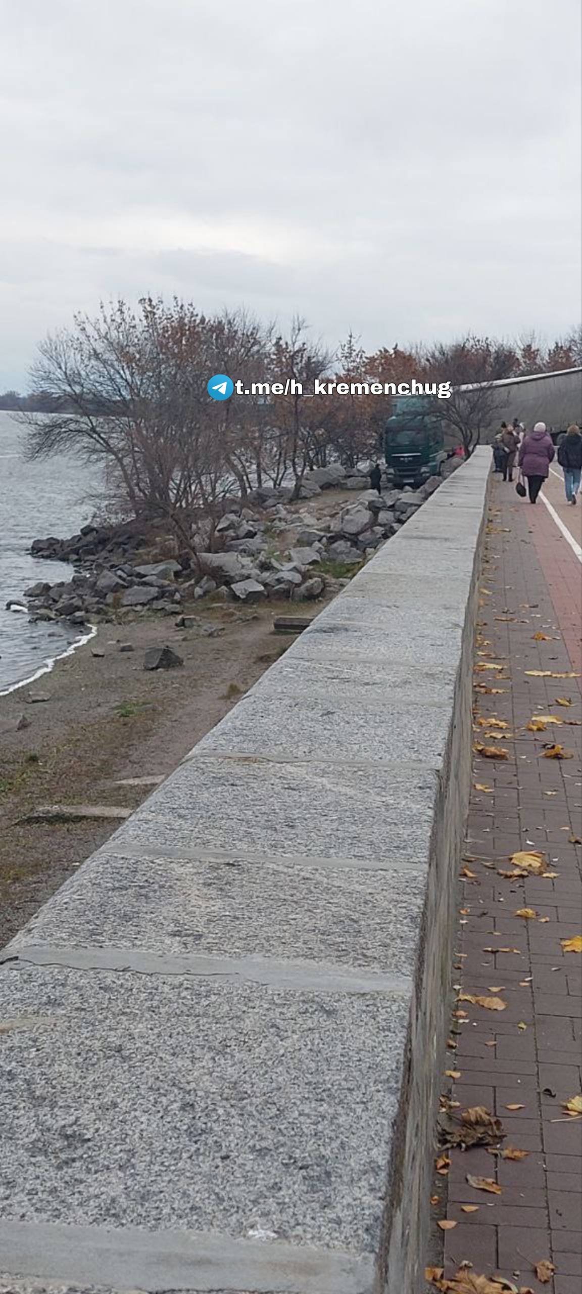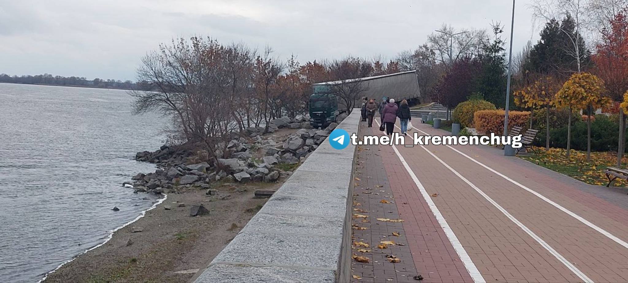 Сьогодні надвечір у центрі Кременчука фура з'їхала на берег і не може виїхати назад. Зі слів водія, він їхав по навігатору, який дав похибку. Небайдужі містяни допомогли з викликом спецтехніки. Тож наразі фуру витягують.