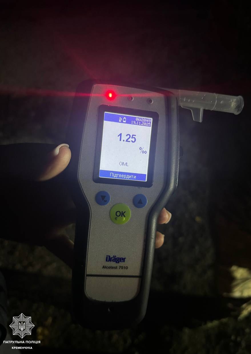 У Патрульній поліції Кременчука розповіли про виявлених минулої ночі на вулицях міста п’ятьох п’яних водіїв. При цьому в одного з порушників вміст алкоголю перевищував допустиму норму у 10 разів, а в іншого — у понад 6 разів.