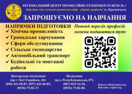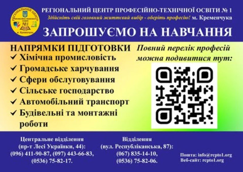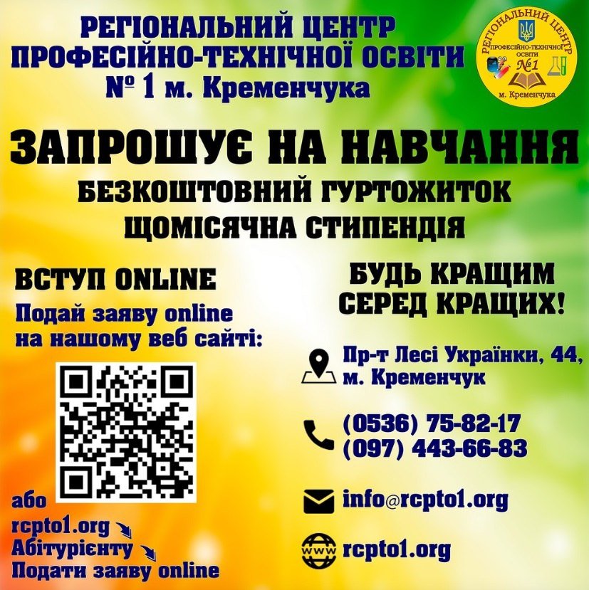 Запрошуємо на навчання в Регіональний центр професійно-технічної освіти № 1 м. Кременчука!