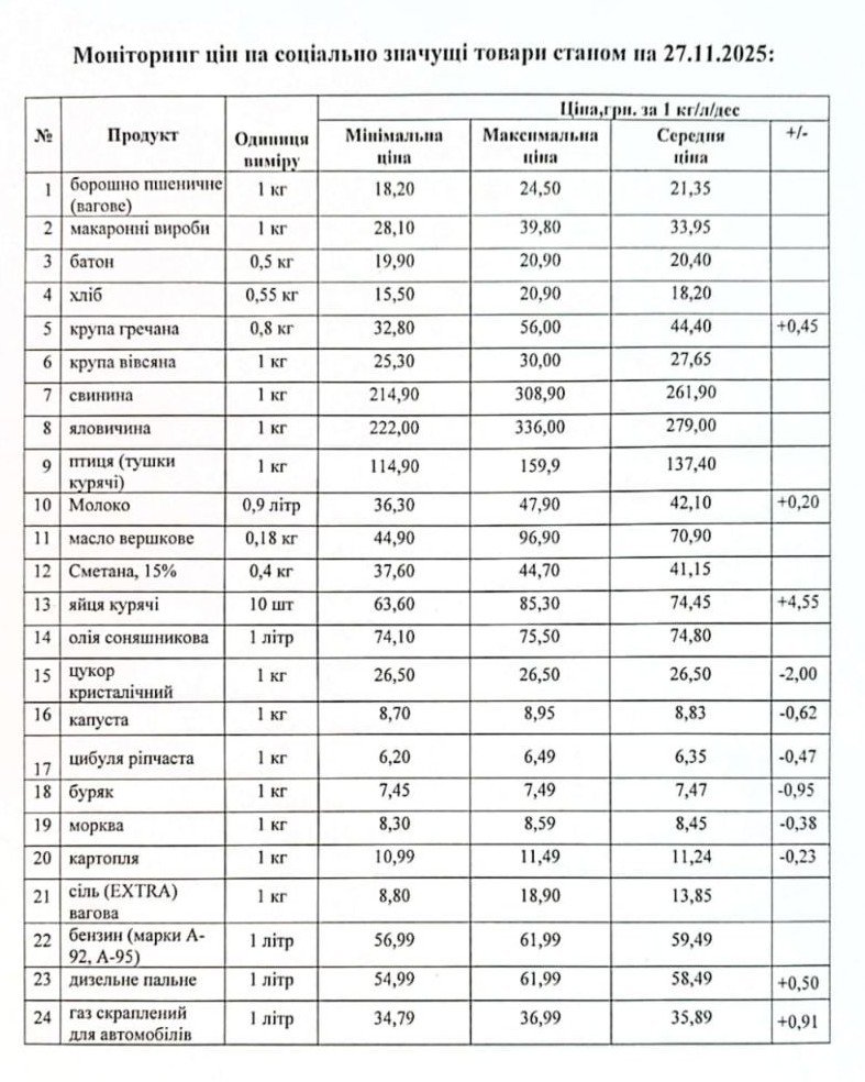 Кременчуцьке районне управління Держпродспоживслужби провело моніторинг цін на соціально значущі товари у торгівельних закладах району станом на 27 листопада. З цією інформацією наше видання ознайомила Кременчуцька районна військова адміністрація.