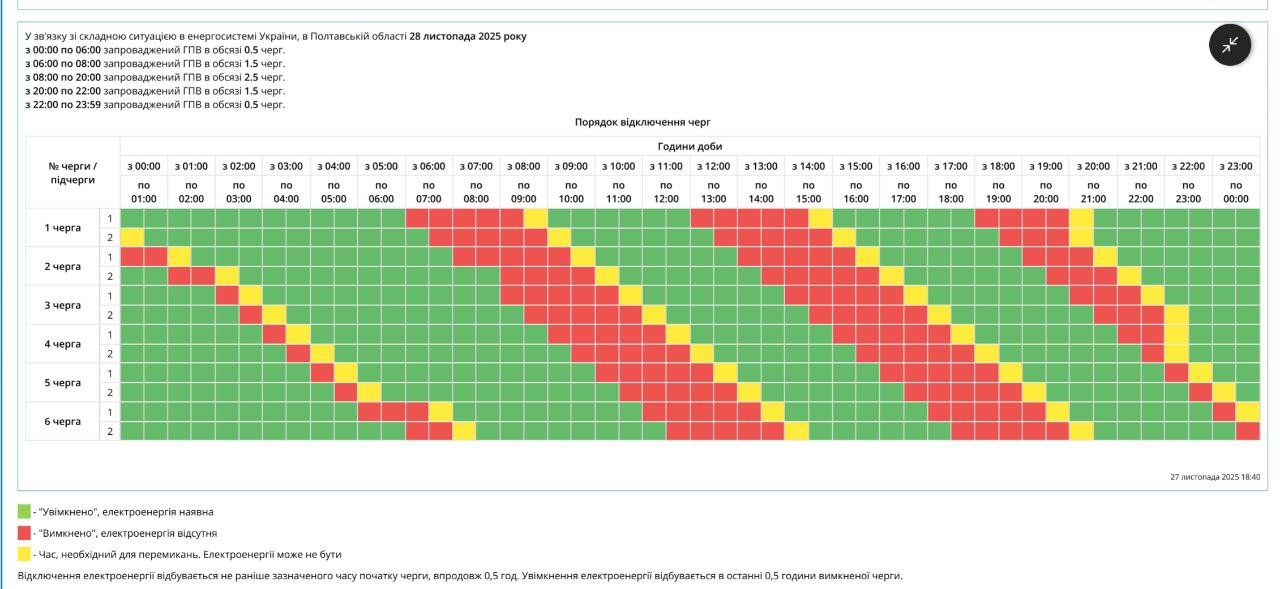 ПАТ «Полтаваобленерго» повідомило, що у зв'язку зі складною ситуацією в енергосистемі України, в Полтавській області у п'ятницю, 28 листопада, буде застосовано графік погодинних відключень: