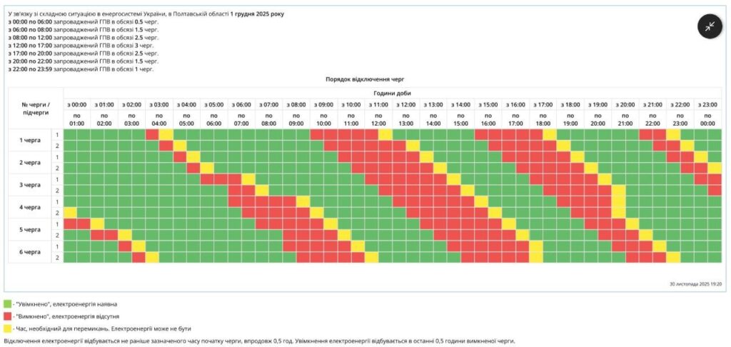 Завтра, 1 грудня, у Кременчуці та на Полтавщині діятимуть графіки погодинного знеструмлення. Про це повідомили у пресслужбі «Полтаваобленерго».