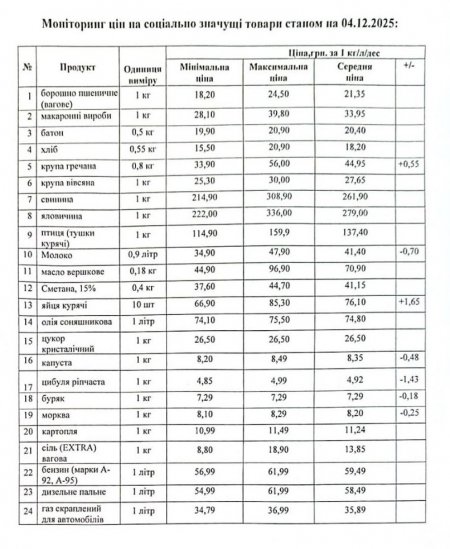 Кременчуцьке районне управління Держпродспоживслужби провело моніторинг цін на соціально значущі товари у торгівельних закладах району станом на 4 грудня. З цією інформацією наше видання ознайомила Кременчуцька районна військова адміністрація.