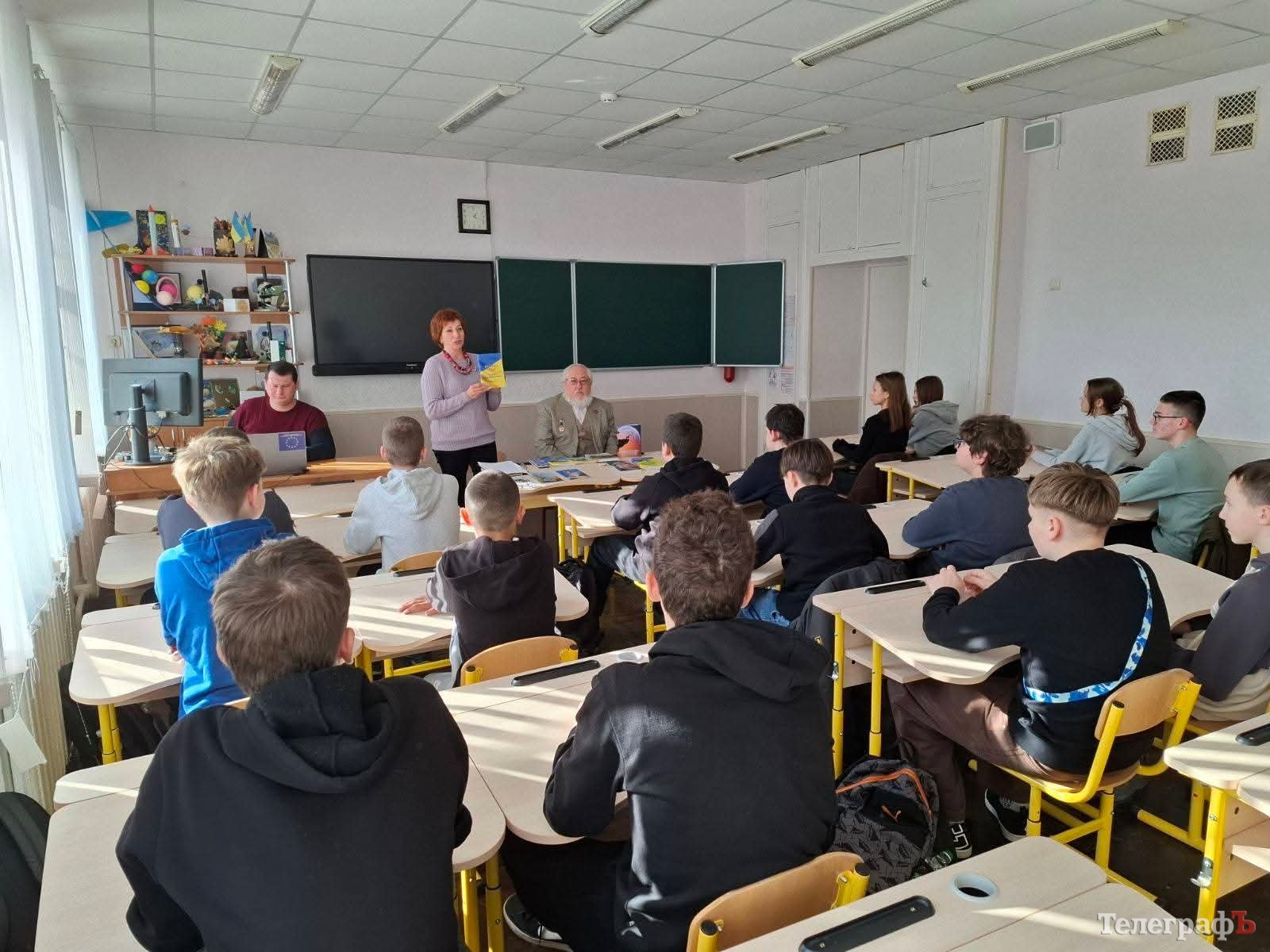 Школярі та вчителі уважно слухали розповідь письменника про різні історичні події, які відбувалися на Полтавщині, видатних особистостей Кременчука, міста-посаду Крюкова, колишніх повітів Полтавської губернії, які описані у тритомному видані «Полтавська губернія», виданому до ювілею колишньої губернії.