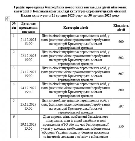 Найбільше показів — з 21 по 25 грудня — проведуть для дітей із сімей внутрішньо переміщених осіб, які проживають на території Кременчуцької громади. Окремі вистави запланували для дітей-сиріт, дітей, позбавлених батьківського піклування, дітей із сімей загиблих захисників України та для дітей з інвалідністю.