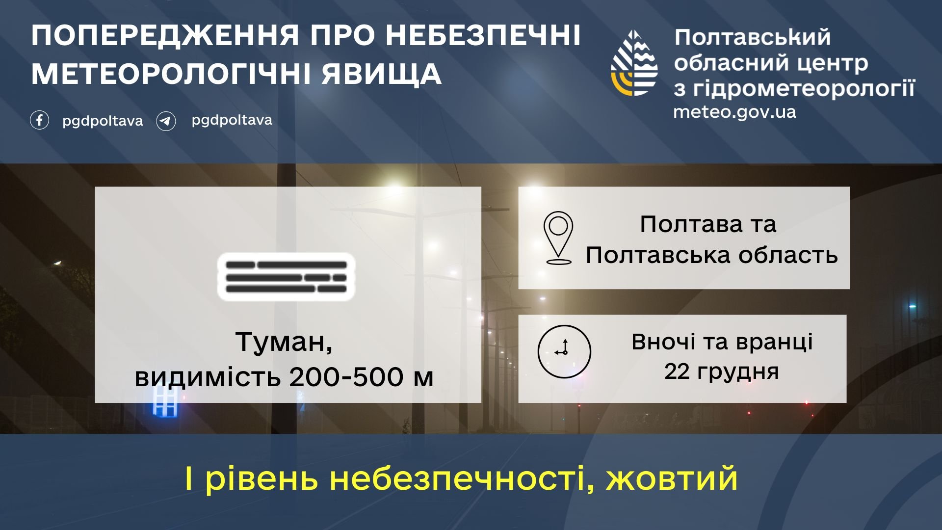 За повідомленням Полтавського обласного центру з гідрометеорології, у понеділок, 22 грудня, на території області очікується туман, видимість — 200-500 м.