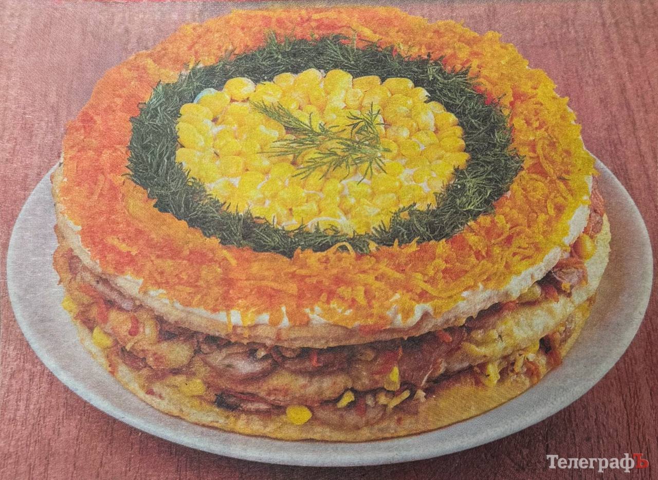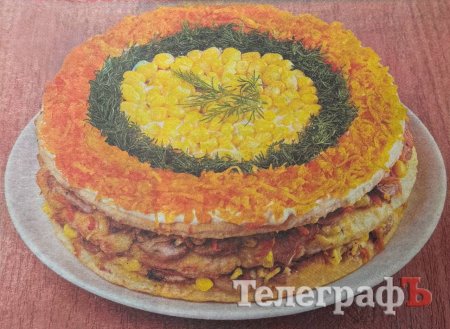 · Сир натерти на терці, зелень порізати та додати до овочів з грибами. Додати кукурудзу та майонез, перемішати.