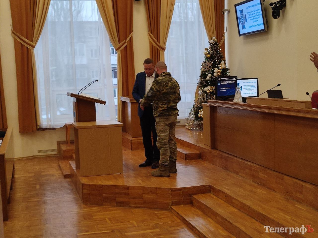 Сьогодні, 26 грудня, на останній у цьому році сесії Кременчуцької міської ради депутати розглянули 168 питань порядку денного. І першим серед них було ухвалення рішення про нагородження Почесною відзнакою — Нагрудним знаком Кременчуцької міської територіальної громади «Доблесть і пошана» старшого солдата однієї з військових частин ЗСУ, який виконує обовязки начальника комплексу радіоелектронної боротьби з БпЛА. Він є мешканцем нашого міста і був присутній у сесійному залі — захиснику України вручили нагрудний знак Кременчуцької міської територіальної громади одразу після ухвалення рішення.