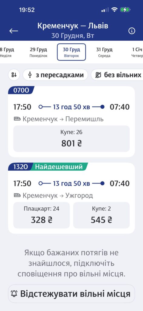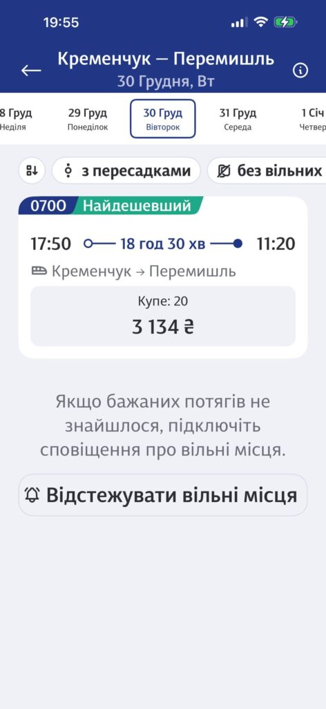 Якщо ж їхати з Кременчука безпосередньо до Перемишля, вартість квитка становить 3134 гривні. Поїзд вирушатиме з Кременчука о 17.50, а прибуватиме до Перемишля об 11.20 наступного дня. Час у дорозі становитиме 18 годин 30 хвилин.