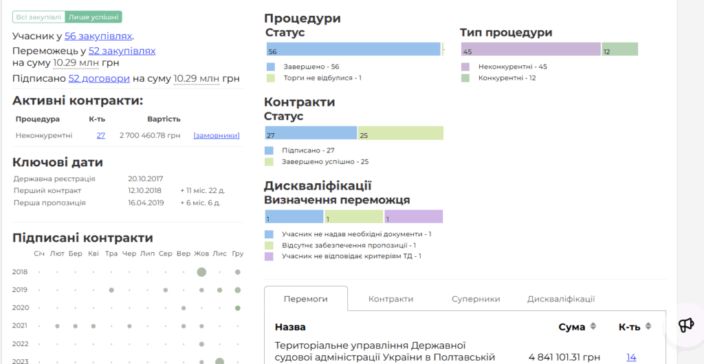 Компанія отримала понад 10 млн грн на тендерах, з них майже половину на ремонт приміщень судів на Полтавщині від Державної судової адміністрації.