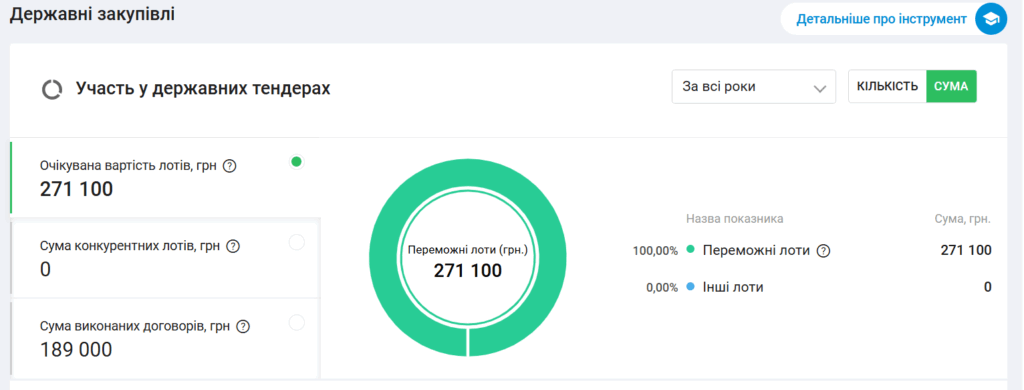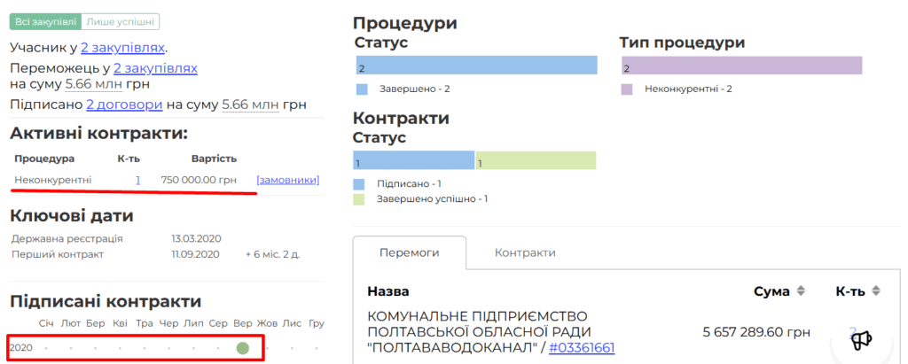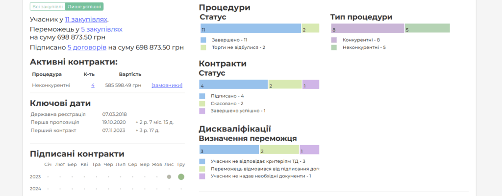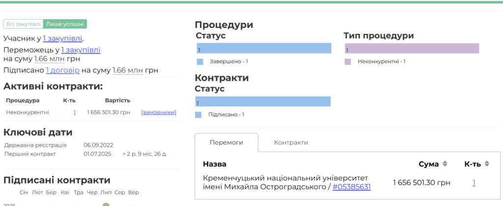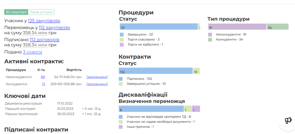 Компанія зареєстрована через півроку після початку повномасштабної війни з капіталом 500 грн, отримала на підрядах понад 360 млн грн. Вона перемогла у 112 тендерах, і більшість з них (91) — неконкурентні, тобто без відкритих торгів або без змагання між постачальниками.