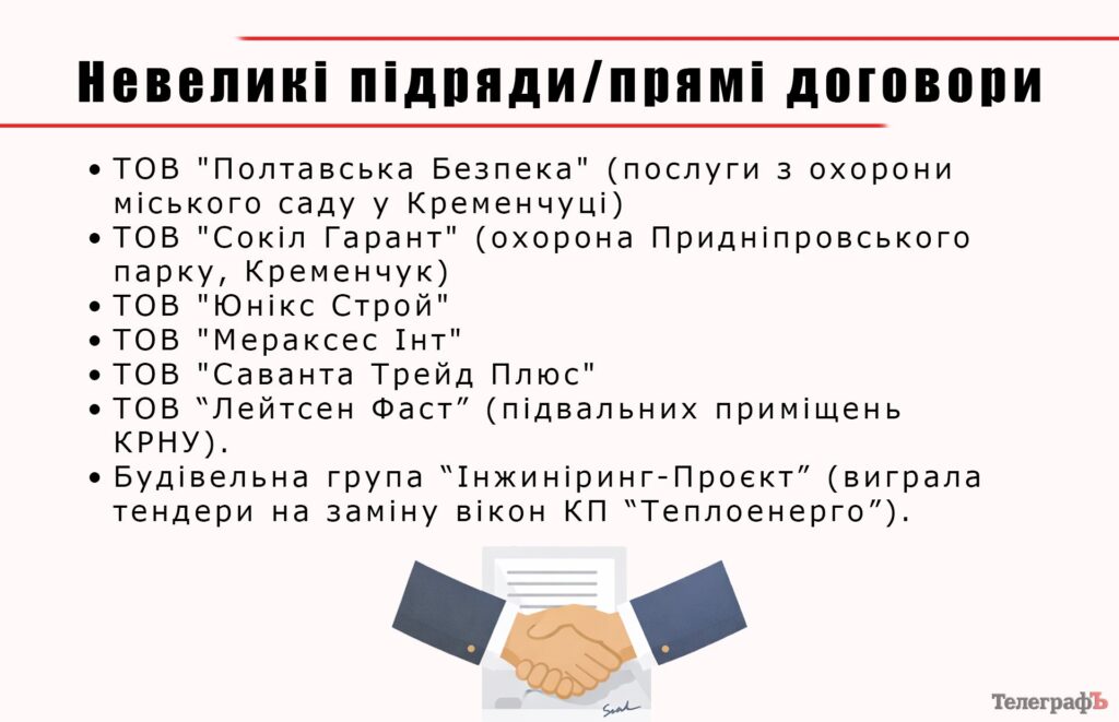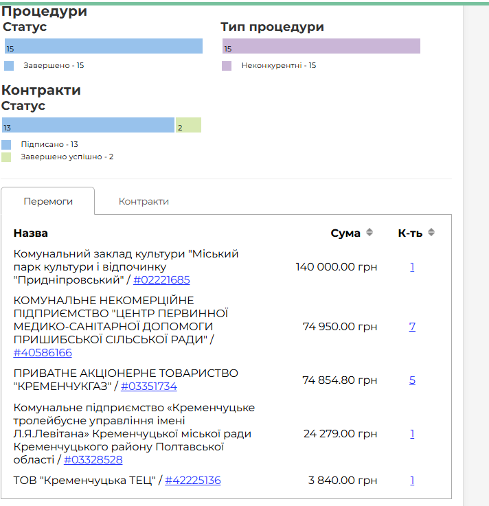 - ТОВ «Сокіл гарант». Виграв понад 300 тис грн на 15 тендерах — усі без проведення конкурсу. Половина за послуги з охорони у парку Придніпровський. Також є постачання апаратури для тролейбусного управління, охоронні послуги Кременчуцької ТЕЦ та Кременчукгазу.
