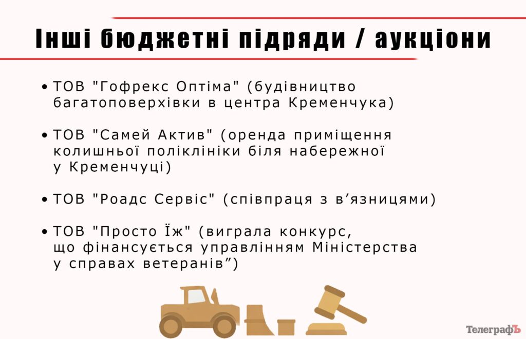 Компанія була єдиним учасником на тендері з ремонту полтавських тротуарів на 5 млн грн. Серед інших замовлень компанії — облаштування приміщень для ВПО, ремонт геріатричного будинку-інтернату у Гарячі, Полтавська обласна клінічна лікарня, Полтавський Краєзнавчий музей, Полтавський ліцей з посиленою військово-фізичною підготовкою та інші.