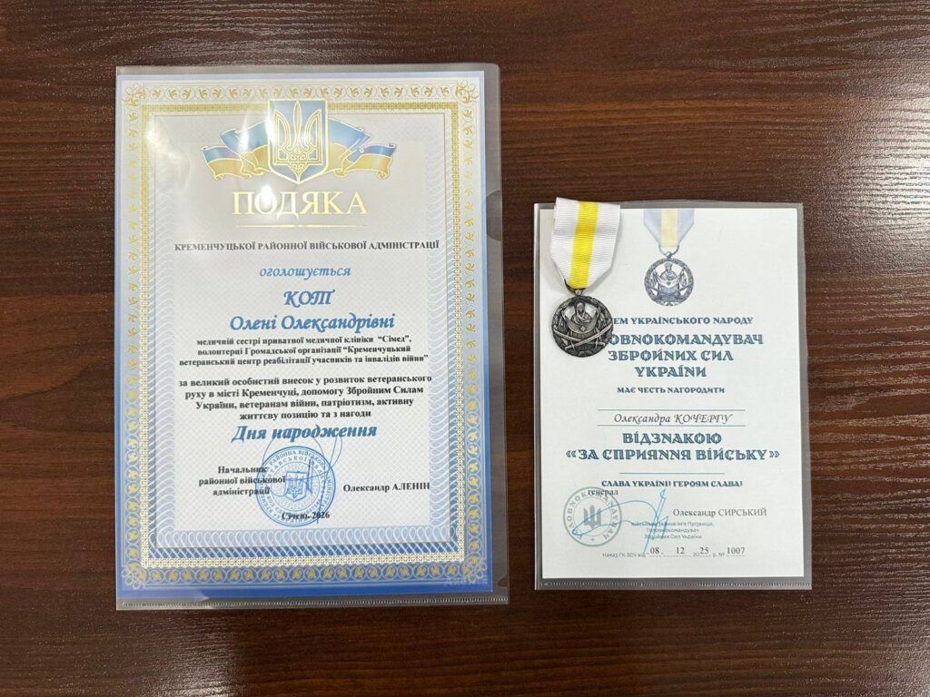 Медсестра приватної медичної клініки та волонтерка громадської організації «Кременчуцький ветеранський центр реабілітації учасників та інвалідів війни» Олена Кот нагороджена подякою Кременчуцької РВА за вагомий особистий внесок у підтримку ветеранів війни, допомогу Збройним Силам України та активну громадянську позицію.