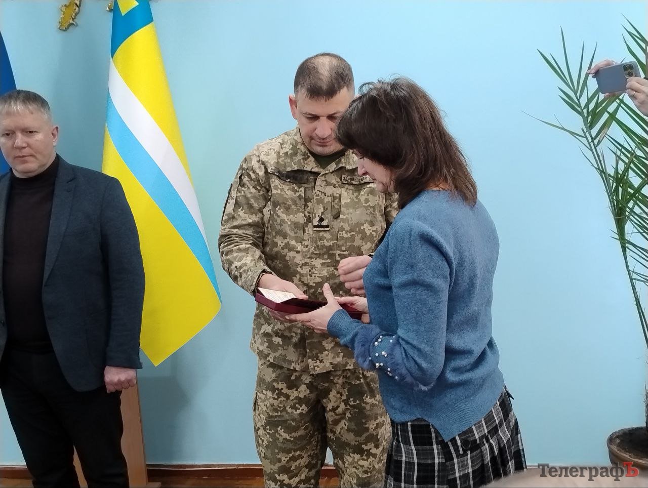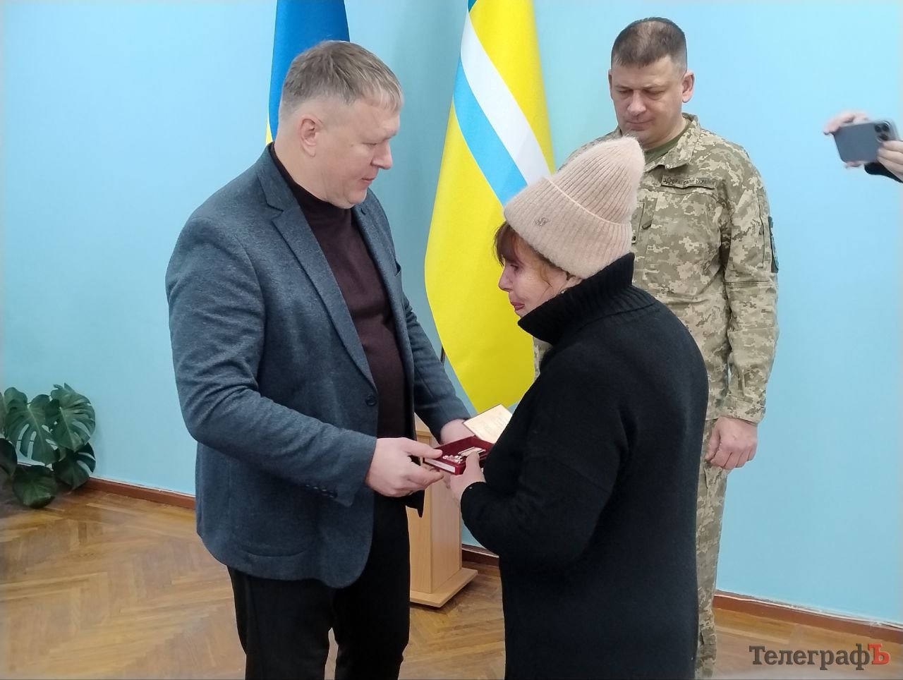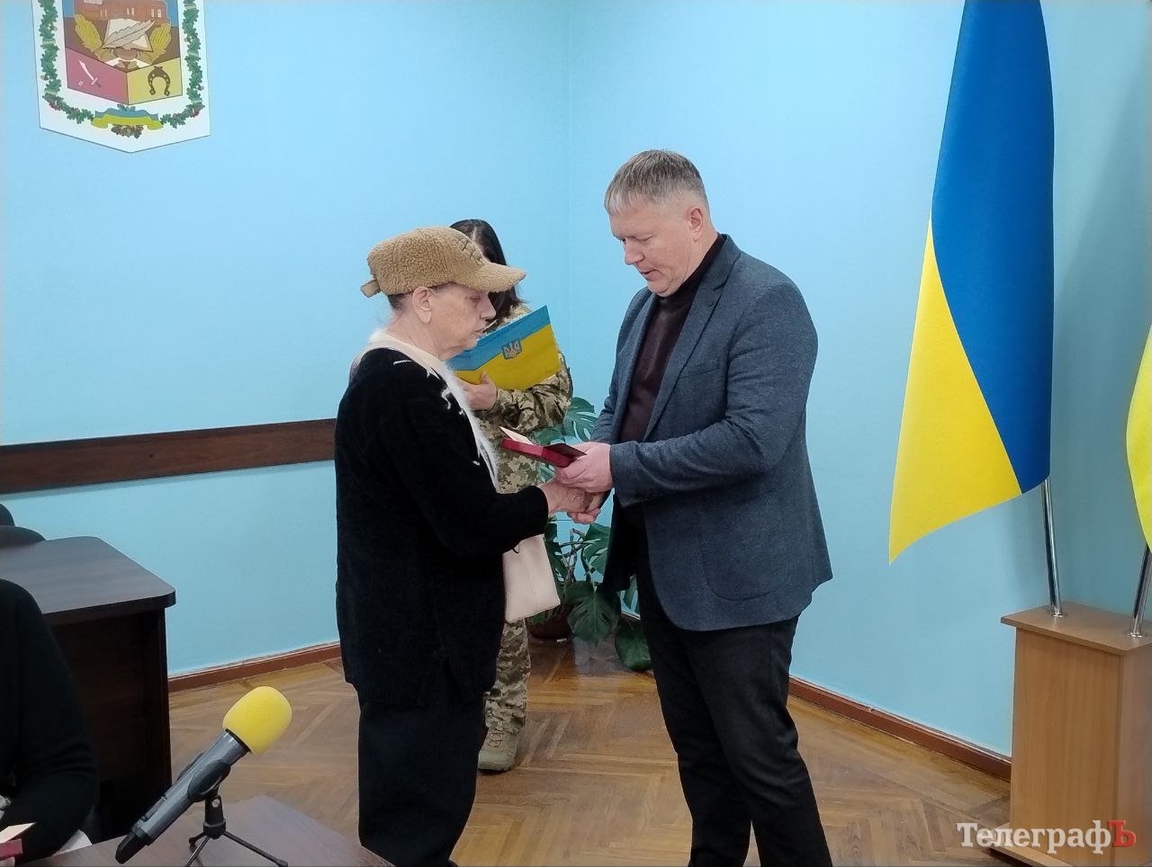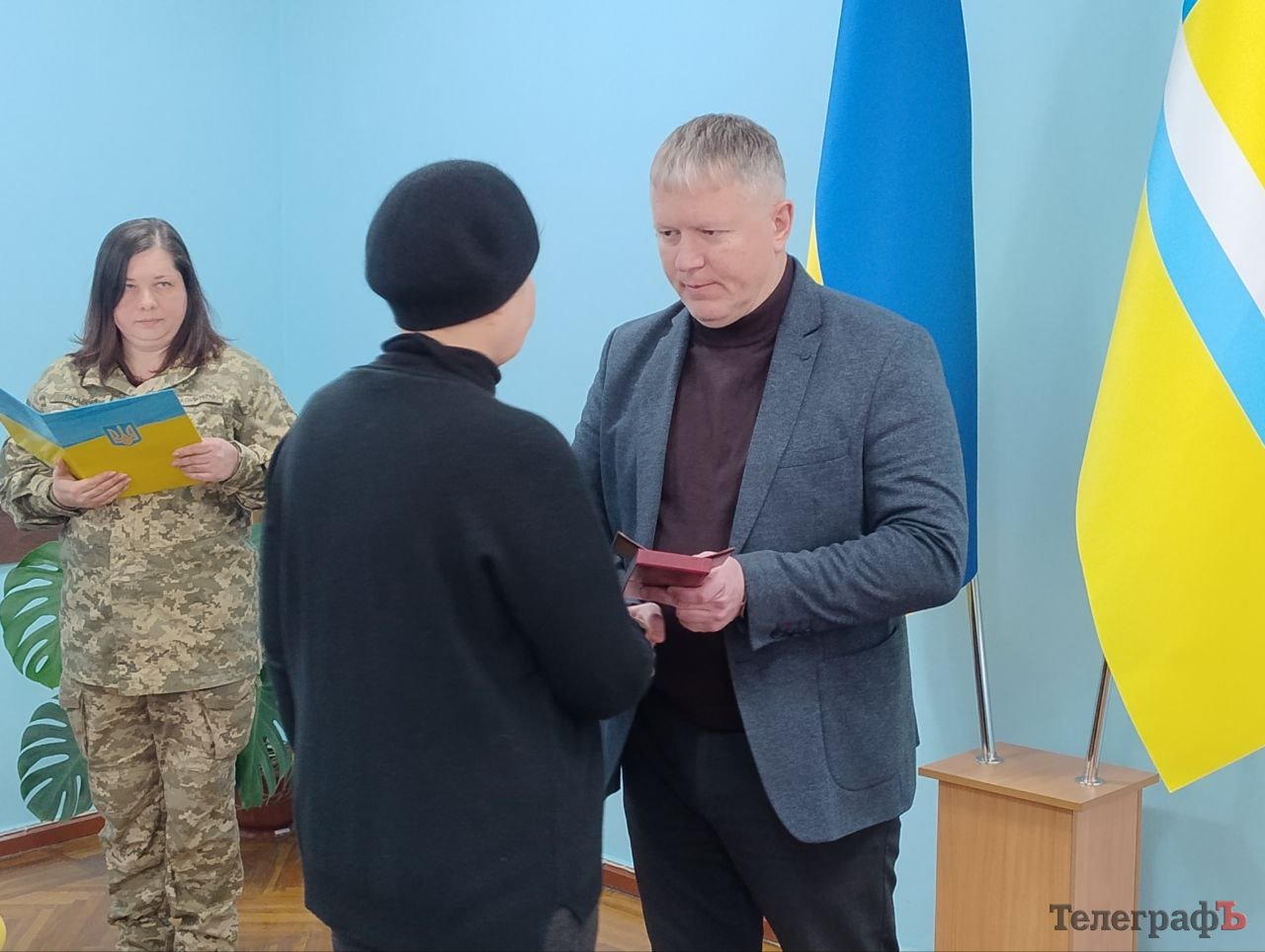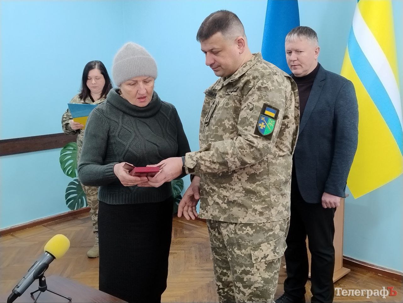 Вручили нагороди близьким загиблих бійців начальник Кременчуцької райвійськадміністрації Олександр Аленін та т. в. о. начальника Кременчуцького районного територіального центру комплектування та соціальної підтримки майор Тарас Саражин.