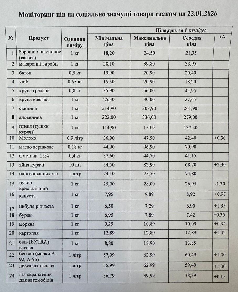 Кременчуцьке районне управління Держпродспоживслужби провело моніторинг цін на соціально значущі товари у торгівельних закладах району станом на 22 січня. З цією інформацією наше видання ознайомила Кременчуцька районна військова адміністрація.