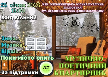 Кременчуківців та гостей міста кличуть у неділю, 25 січня, до бібліотеки на музично-поетичний квартирник «Зима… Музика… Вірші… Поки місто спить». Про проведення заходу журналістам «Кременчуцького Телеграфа» повідомили організатори.