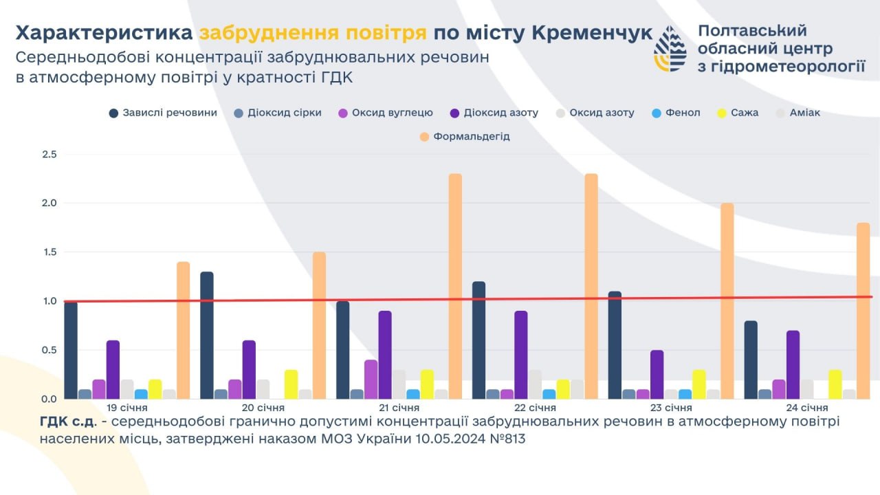 У Кременчуці протягом тижня з 19 по 24 січня фахівці зафіксували перевищення середньодобових гранично допустимих концентрацій окремих забруднювальних речовин в атмосферному повітрі. Про це повідомив Полтавський обласний центр з гідрометеорології.