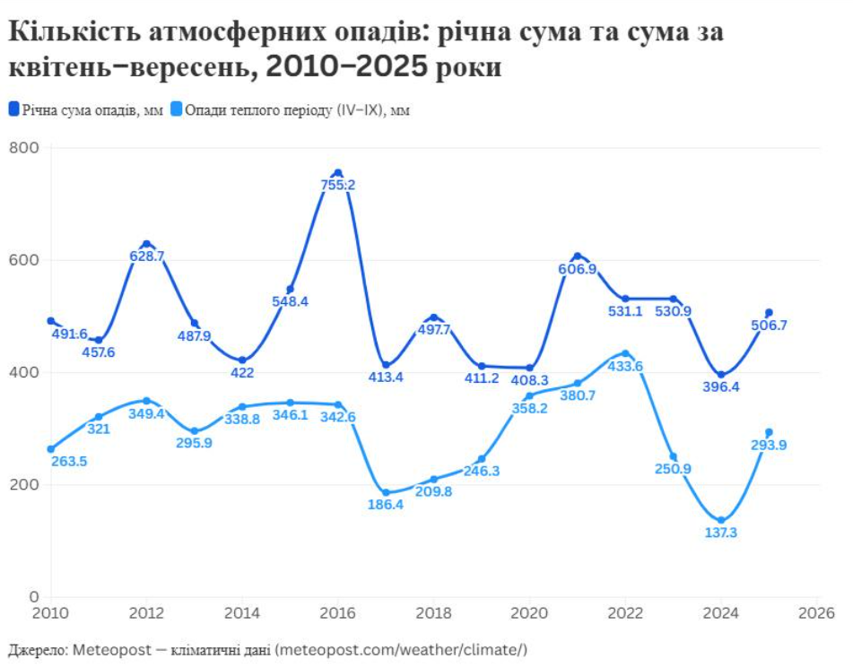 Кількість опадів визначає, скільки води загалом може надійти в річкову систему, але їхній вплив на рівень води не є прямим. Метеоспостереження у Світловодську показують, що у 2010–2025 роках річні суми опадів істотно коливалися. Водночас важливе не лише те, скільки опадів випадає за рік, а й коли саме це відбувається — у різні роки їхній сезонний розподіл суттєво відрізнявся. Саме тому опади не завжди напряму позначаються на рівні води Кременчуцького водосховища.