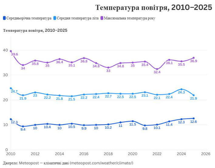 Дані метеоспостережень у Світловодську показують, що температура повітря у 2010–2025 роках змінювалася і загалом зростала, що призводить до більш інтенсивного випаровування. Водночас рівень води у Кременчуцькому водосховищі в цей самий період не повторює цих коливань і демонструє стабільно вищі відмітки. Це означає, що температурний чинник не пояснює зростання рівня води у водосховищі.