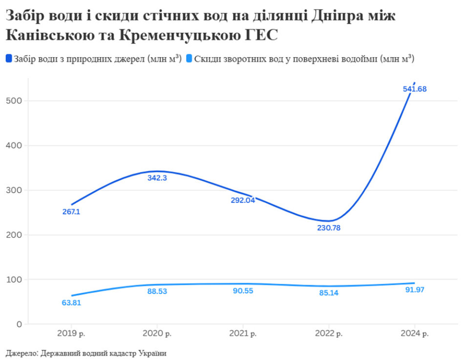На основі даних Державного водного кадастру для ділянки Дніпра між Канівською та Кременчуцькою ГЕС видно, що за останні роки обсяги водозабору (водозабір — вода, яку відводять з річки для комунальних, промислових або аграрних потреб) зросли разом із кількістю водокористувачів.