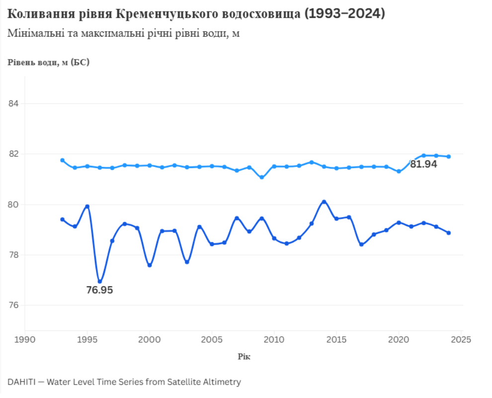Щоб зрозуміти, як змінювався рівень води у Кременчуцькому водосховищі, ми проаналізували супутникові вимірювання за 1993–2024 роки. За ними визначили найвищі та найнижчі зафіксовані значення протягом кожного року — це дозволяє побачити, у якому діапазоні фактично утримується водосховище.