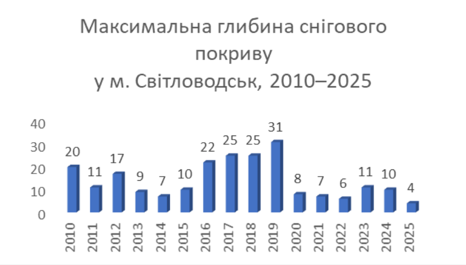 Графік максимального снігового покриву, за даними метеоспостережень у Світловодську, розташованому безпосередньо біля Кременчуцького водосховища, показує зменшення кількості снігу в останні роки. Водночас період після 2020 року (2020-2025) не супроводжується зниженням рівня води у водосховищі: навпаки, малосніжні зими збігаються з вищими мінімальними й максимальними рівнями води, зафіксованими супутниковими даними. Це свідчить про те, що сам сніговий фактор не пояснює підвищення рівня води.