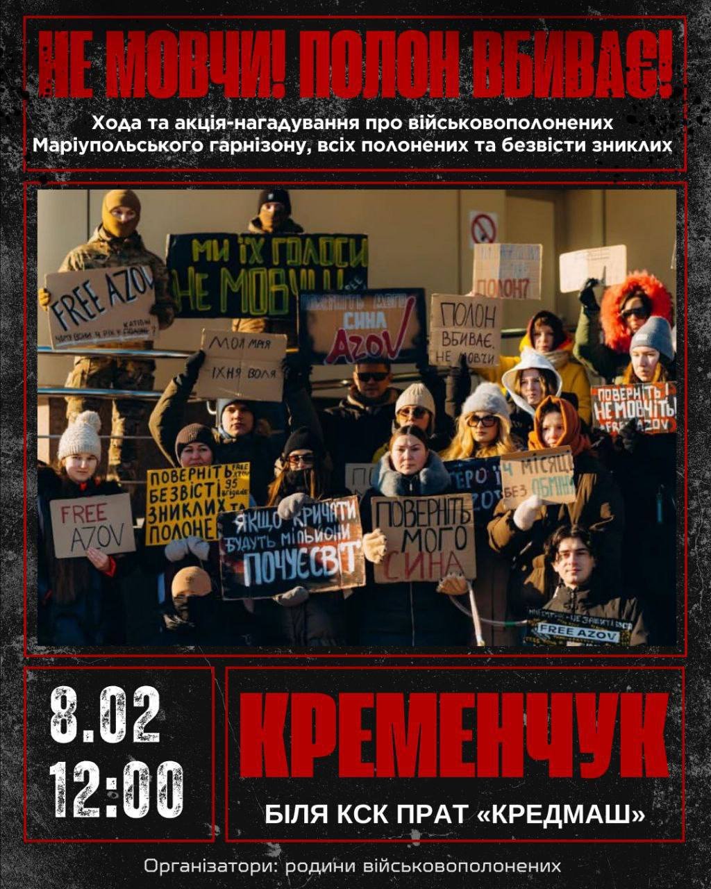 Цієї неділі, 8 лютого, о 12.00 у Кременчуці відбудеться традиційна акція-нагадування під гаслом «Не мовчи! Полон вбиває!».