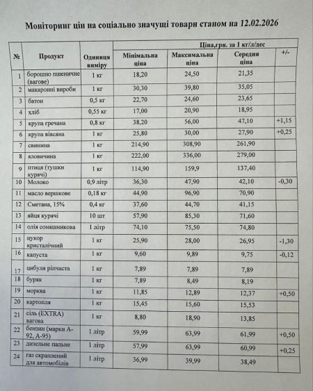 Кременчуцьке районне управління Держпродспоживслужби провело моніторинг цін на соціально значущі товари у торгівельних закладах району станом на 12 лютого. З цією інформацією наше видання ознайомила Кременчуцька районна військова адміністрація.