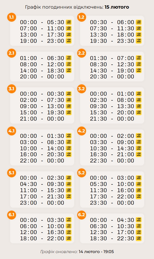 «Полтаваобленерго» повідомило, що у зв'язку зі складною ситуацією в енергосистемі України, в Полтавській області у неділю, 15 лютого, буде застосовано графік погодинних відключень (ГПВ) електроенергії: