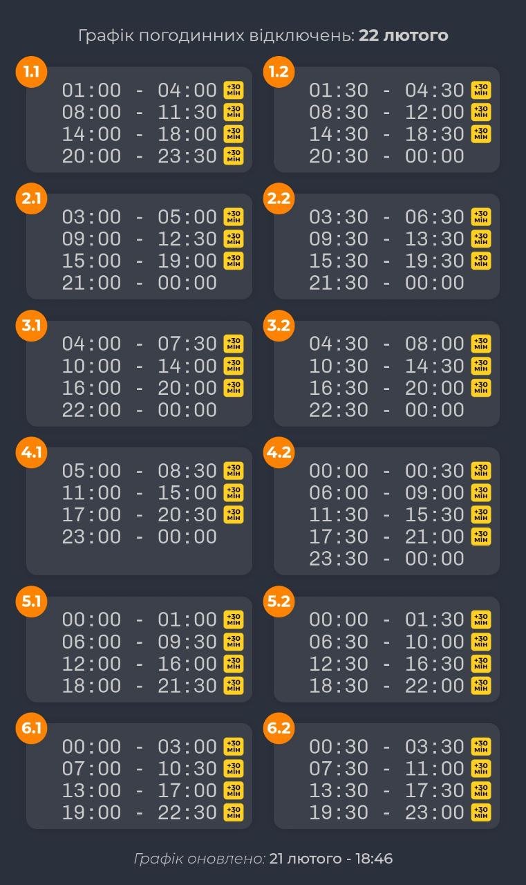 ПАТ «Полтаваобленерго» повідомило, що у зв'язку зі складною ситуацією в енергосистемі України, в Полтавській області у неділю, 22 лютого, буде застосовано графік погодинних відключень (ГПВ) електроенергії: