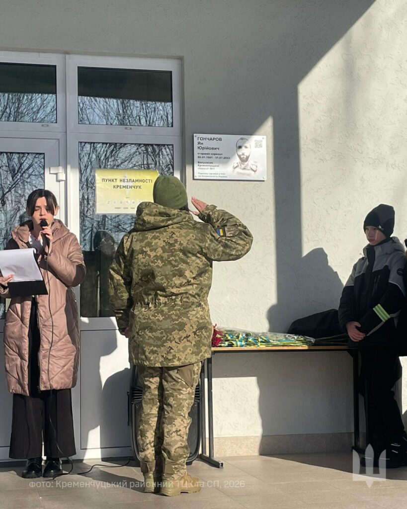 Сьогодні, 23 лютого, у Кременчуці на фасаді гімназії № 1 відкрили меморіальну дошку на честь старшого сержанта Яна Гончарова, який загинув на Донеччині під час виконання бойового завдання. Про це повідомили у пресслужбі Полтавського обласного ТЦК та СП.