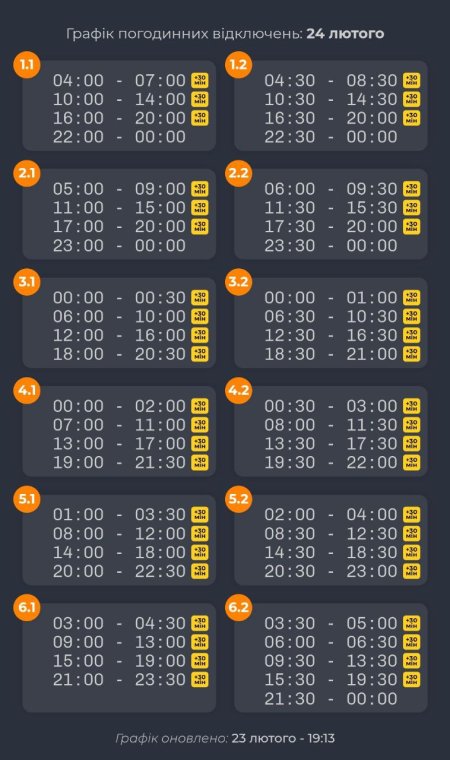 ПАТ «Полтаваобленерго» повідомило, що у зв'язку зі складною ситуацією в енергосистемі України, в Полтавській області у вівторок, 24 лютого, буде застосовано графік погодинних відключень (ГПВ) електроенергії: