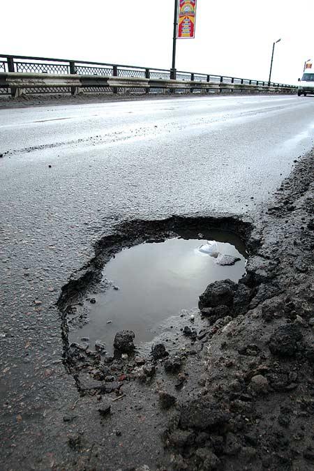 На нове асфальтове покриття мосту через Дніпро фірма «Талєкріс» дала гарантію десять років. Та хвалене диво сучасних шляхово-будівельних технологій вже дало тріщини, з яких «виросли» ями. Міст обіцяють латати, і це вже не вперше після капремонту.