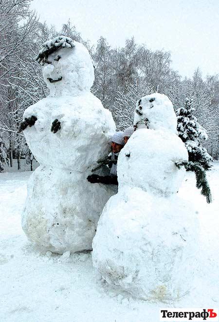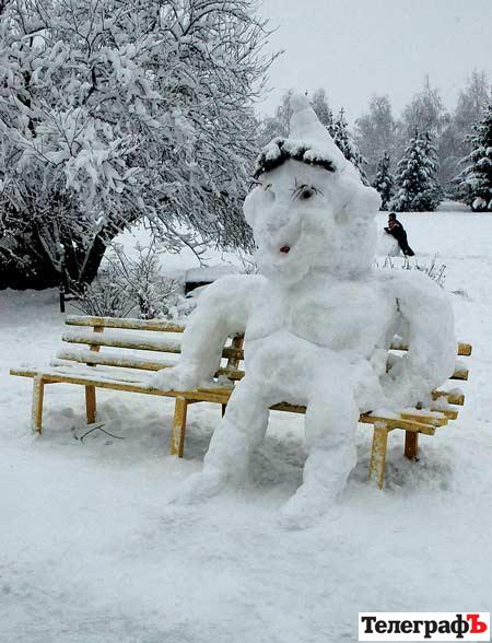 Сніговиків ліпили по усьому місту – вони були і на подвір’ях, і вздовж доріг, і у парках. Та найбільше різноманітних персонажів, зроблених зі снігу, було у парку Мира. Тут можна було зустріти і котика, що розлігся на лавочці, і снігових зайчика та ведмедика, і велетенських сніговиків, поруч із якими люди здаються зовсім маленькими, і навіть чудернацьку снігову людину, що розсілась на лавочці.