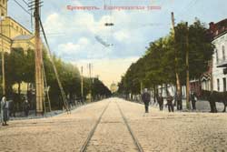 Єкатерининська вулиця. Початок ХХ століття.  Тривалий час стан кременчуцьких вулиць не витримував критики: «Хто у Кременчуку не бував, той пилу не бачив», – писали у столичній пресі. На початку 80 років ХVІІІ століття Єкатерининську вимостили бруківкою. Це стало значним досягненням комунального господарства і першим випадком твердого покриття вулиці в історії міст Полтавської губернії. Проблемою було і озеленення. Дерева часто гинули через поганий грунт, тому перевагу віддавали міцним і непримхливим деревам: білим акаціям та американським кленам.