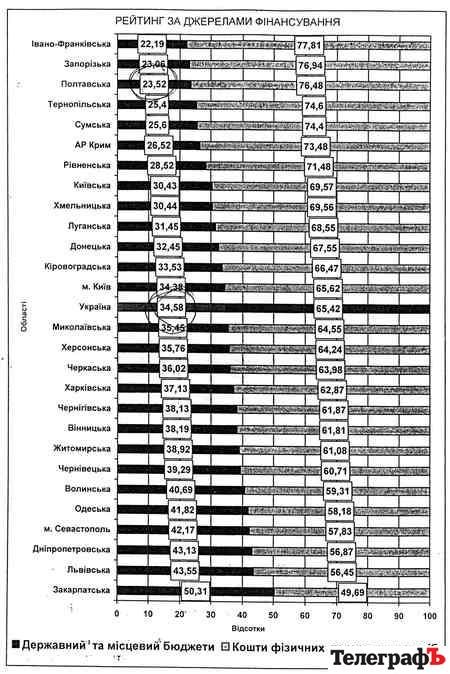 Якось некоректно вважати Кременчук або навіть усю Полтавщину жлобським регіоном. Але ситуація складається саме так. Надто вже мало владні структури області і міста надають допомоги регіональним вищим навчальним закладам. Кожен, хто має дочку або сина-студента, знає, що вчити дорого. Ну, так ми розповімо чому так. Існує в природі такий цікавий, хоча й сумний документ – «Інформаційно-аналітичні матеріали до засідання підсумкової колегії Міністерства освіти і науки» (від 21 березня 2008 року). Він містить таблицю рейтингів за джерелами фінансування. У ній вказано, яку кількість студентів (у відсотках) у кожній області України фінансує держава та місцеві бюджети, а яку – батьки. Таблиця перед вами.