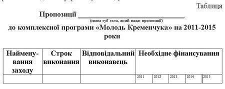 Учитывая то, что Комплексная программа «Молодежь Кременчуга» на 2006-2010 годы заканчивает свое действие, на выполнение Государственной целевой социальной программы «Молодежь Украины» на 2009-2015 годы, утвержденной Постановлением Кабинета Министров Украины от 28.01.2009 № 41, отдел по делам семьи и молодежи исполкома городского совета инициирует разработку и принятие Комплексной программы «Молодежь Кременчуга» на 2011-2015 годы. Жителям Кременчуга предлагается внести свои предложения в эту программу.