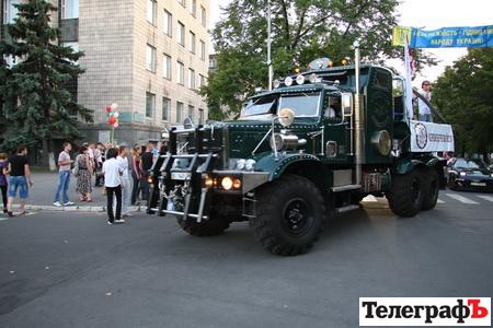 Около 16 часов в городе стартовал автопробег – несколько легковушек во главе с КрАЗом проехались по городу. С собой они возили флаги, на которых красовались логотипы нескольких предприятий