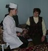 В комнате отдыха. Здесь люди раздеваются, приводят себя в порядок. Студентки медицинского колледжа спрашивают их о здоровье, измеряют давление. Из этой комнаты пенсионеры идут в другие кабинеты.
