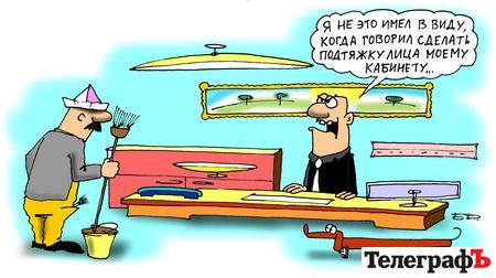 Щойно прийшовши до влади, міський голова пан Бабаєв розпочав масштабний ремонт власного кабінету у міськвиконкомі. Журналістам пан мер пояснив, що це потрібно не йому особисто, а всьому місту – адже кабінет міського голови – це обличчя Кременчука, і одним косметичним ремонтом тут не відбудешся! Тому пан мер проводить грунтовну кругову підтяжку цього самого «обличчя міста» – тобто, солідний ремонт. Ми дуже сподіваємось, що після того, як «обличчя міста» доведуть до ладу, пан мер візьметься і за, так би мовити, «тіло міста» – школи, шкільні їдальні, лікарні, поліклініки, дитсадки, дороги тощо. Адже у Кременчука все має бути прекрасним – і «обличчя», і «тіло».