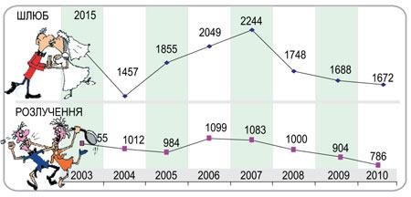 Розлучень також стало менше – пар, що побажали розірвати шлюб, відсотків на 15 менше, ніж у 2009 році. Пані Проценко зазначає, що це явище є всеукраїнською тенденцією.