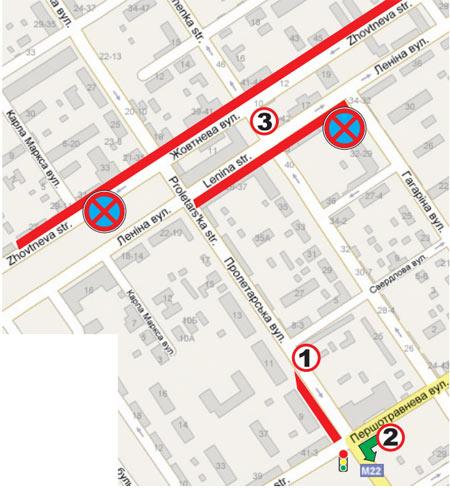 ДАІ пропонує розширити вул. Пролетарську від зупинки «Ринок» (в районі магазину «Адідас») до перехрестя з Першотравневою. Дотепер тут дві смуги руху і лише з однієї можна прямувати з Пролетарської у бік Крюківського мосту. Після розширення з‘явиться додаткова смуга руху. Як наслідок – значно зменшиться кількість автомобілів, що стоятимуть до перетину перехрестя.