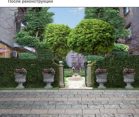 Такий міні-сад пропонують створити навпроти салону «Марія Арт-студіо». За цим ескізом, у середині подвір’я розташований фонтан та лавочки для відпочинку.