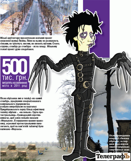 «І меру обрізка сподобалась». Міська влада оголосила двомісячник чистоти. По місту почалося «велике обрізання». Двірники безграмотно ріжуть кущі у дворах. А працівники КП «Благоустрій Кременчука» порізали липи на центральній вулиці міста. «На обрізку дерев дав добро віце-мер Андрій Погрібний. І меру обрізка сподобалась!» – каже начальник цеху озеленення КП «Благоустрій Кременчука».