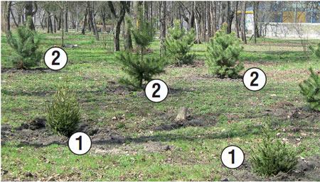 Це – наочний приклад заполошних «суботникових» посадок за бюджетні кошти. У Придніпровському парку під час суботника біля літньої сцени висадили разом 10 ялинок (на фото №1) та 10 сосен (№2).