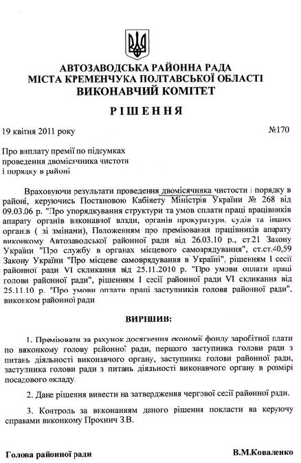 Міська влада закликає кременчужан працювати на двомісячнику чистоти з ентузіазмом і, головне, безкоштовно. Між тим, Автозаводський райвиконком започаткував симпатичну ініціативу. Узяв, і підготував рішення № 170 (від 19 квітня 2011 р) “Про виплату премії по підсумках проведення двомісячника чистоти в районі” .