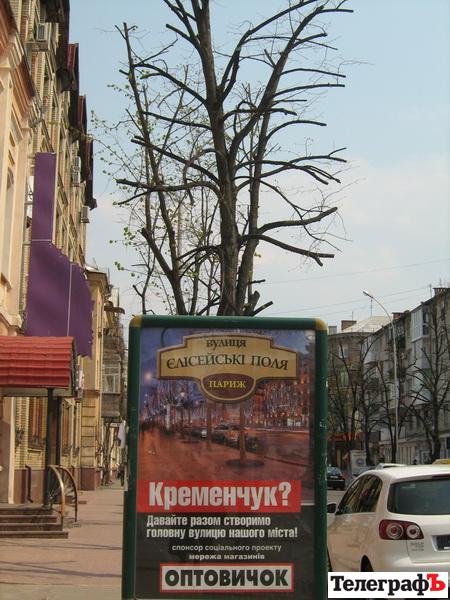 Найпершу та найефектнішу обрізку КП «Благоустрій Кременчука» здійснило на вулиці Леніна. До речі, якраз біля міськвиконкому вулицю прикрашає життєрадісний білборд, профінансований мережею магазинів “Оптовичок”. На ньому фото вечірніх Єлесейських полів (Париж) і оптимістичний напис: “Вулиця Єлесейські поля, Париж. Кременчук. Давайте разом створимо головну вулицю нашого міста!”