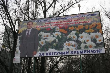 16 квітня у Кременчуці пройшов загальноміський суботник. Весь день політики та посадовці різних рангів бігали по місту з лопатами (а дехто з граблями) – саджали дерева, прибирали сміття і позували перед телекамерами. Міський голова пан Бабаєв саджав дерева на вулиці Гагаріна, регіонали саджали у скверах «Юність» та «Депутатський».