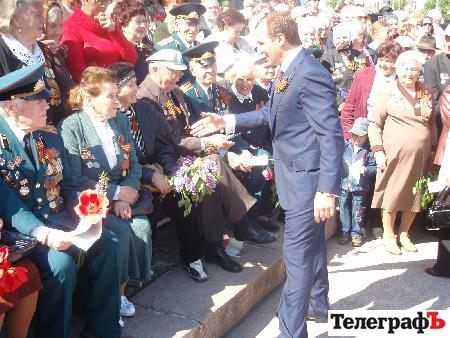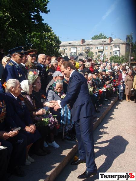- Перед началом митинга мэр Кременчуга Олег Бабаев подошел к ветеранам, которые сиделе на специально установленных скамейках, и поздравил каждого из присутствующих с Днем Победы.